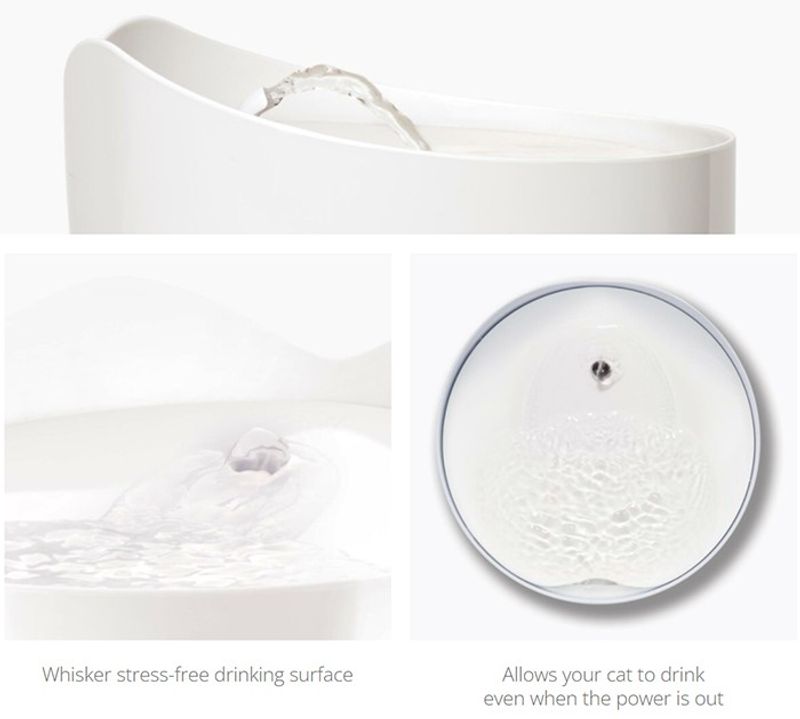 Pixi vattenfontän har en tystgående motor, en nattlampa och en fiffig LED-belysning. LED-belysningen indikerar när det är dags att fylla på vatten i din fontän, då tänds en lampa på kattens nos framtill. Att ha en vattenfontän till din katt kan på sikt förebygga bland annat njurproblem då vatten i rörelse kan göra att din katt vill dricka mer vatten, det lockar fram den naturliga instikten.