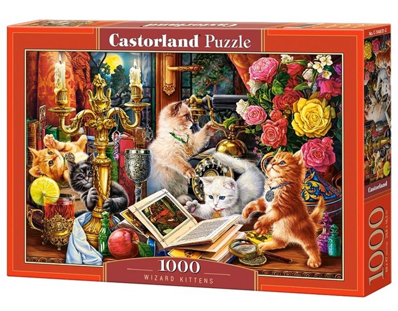 Pussel med kattmotiv från Castorland. Motiver föreställer 5 katter som busar i en trollkarls-inspirerad miljö. 1000-bitars pussel med bitar av bra kvalité och skarpa bilder.