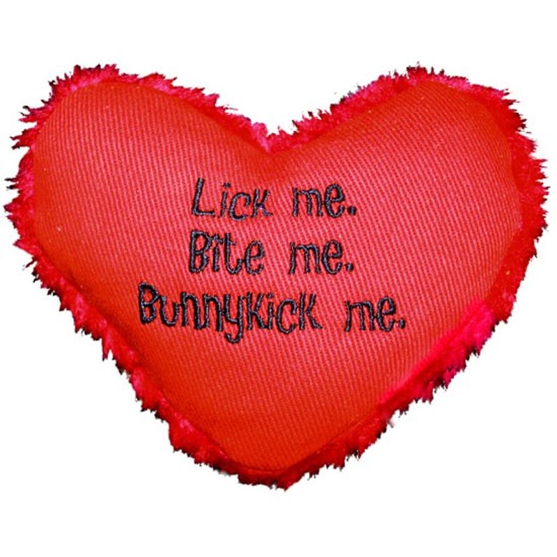Hjärtan fulla med kärlek och attityd, fullproppade med ekologiskt odlad kattmynta, inte konstigt att denna leksak kommer att bli din kisses kärlek direkt! Broderad text: "Lick me. Bite me. Bunny kick me."