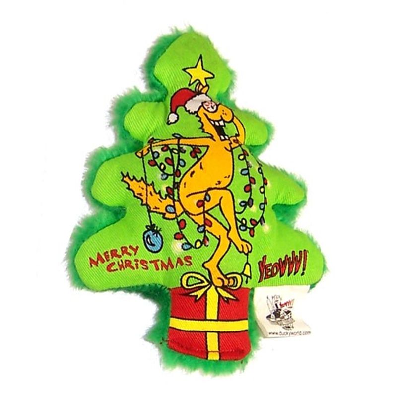 Superfina Katten Kris, Yeowwws egen frontfigur, i julversion med fint motiv med gran, ljusslinga och paket. Slitstarkt denimtyg på framsidan och en lurvig grön baksida, fullspäckad med stark kattmynta!