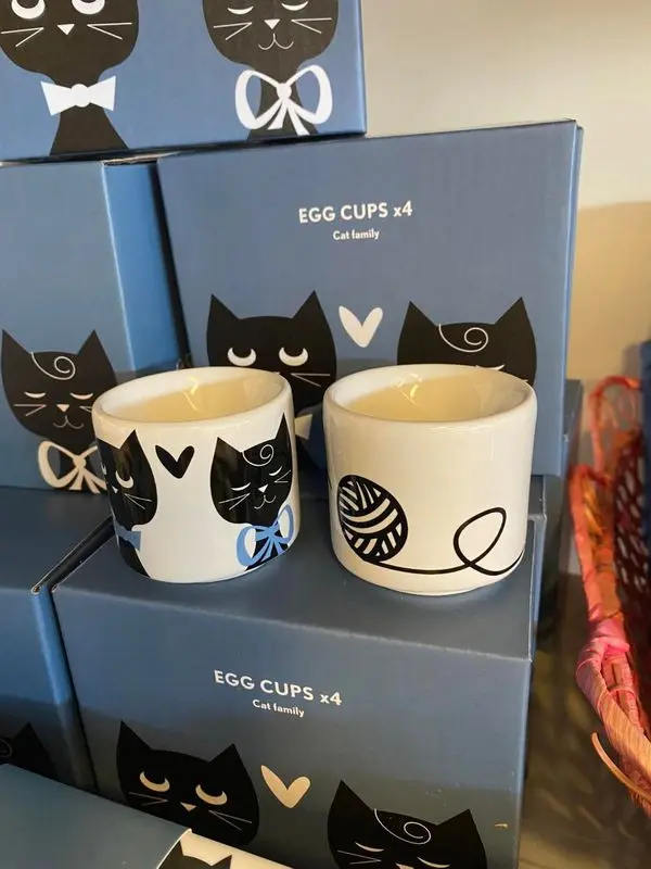 Superfint set med 4 st äggkoppar, vit keramik med kattiga motiv. Perfekt att duka upp till helgfrukosten med familjen, eller brunschen med dina vänner! Pryder sin plats på bordet.