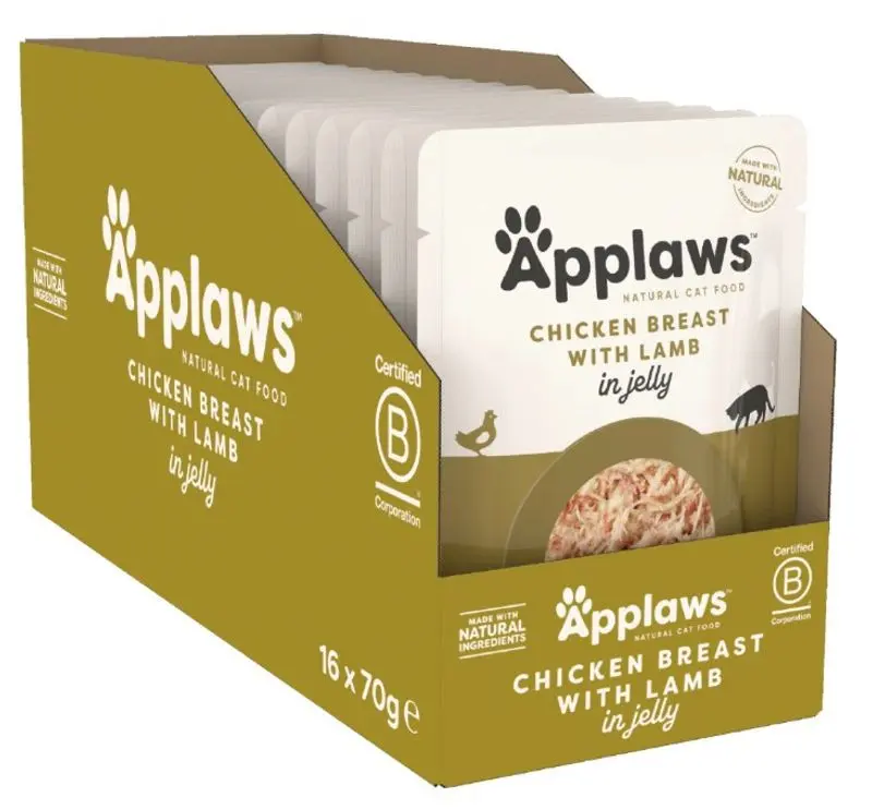 Applaws i smidig portionspåse; köttbitar i gelé med naturligt kycklingbröst och lammkött. Strimlor i gele. Applaws kattmat är ett högkvalitativt kompletterande kattfoder som endast innehåller naturliga ingredienser, utan tillsatser av smakförstärkare.
