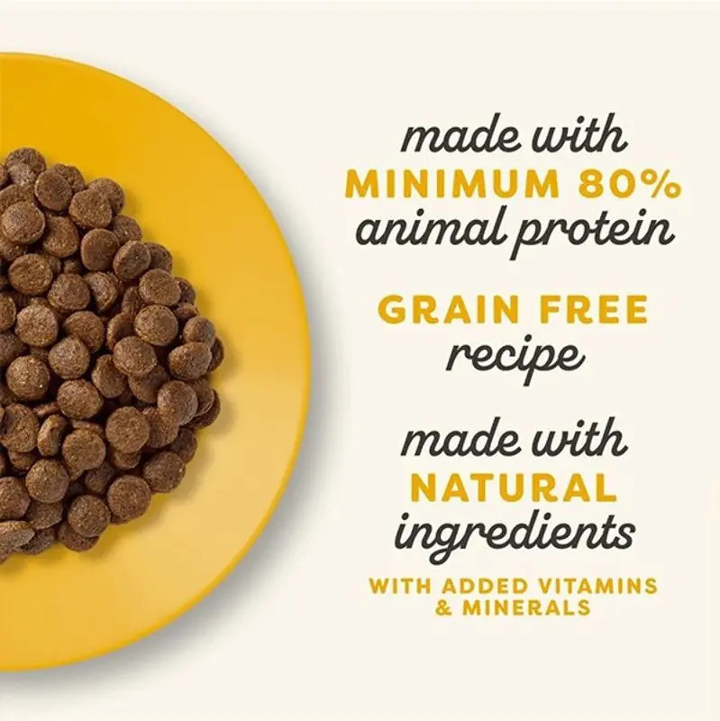 Kycklingmjöl 67%, kycklingfärs 12%, potatis, betmassa, öljäst, kycklingspad 1%, cellulosaväxtfibrer 0,5%, laxolja, kokosnötolja (naturlig källa för MCT oljor), vitaminer och mineraler, äggpulver, kalciumkarbonat, natriumklorid, sjögräs/kelp, tranbär, DL-metionin, kaliumklorid, palmoljeextrakt, citrusextrakt, rosmarinextrakt.