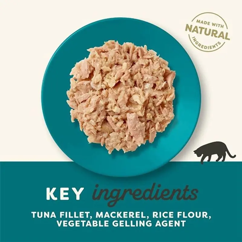 Innehåll: Tonfiskfile 55%, makrill 5%, rismjöl, vegetabiliskt gelatiniseringsmedel.