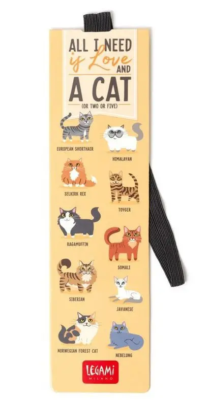 Mycket stabilt bokmärke av papp, med ett jättefint motiv av flera olika kattraser. Sätt in bokmärket där du är i boken, undvik därmed att vika "hundöron" i dina böcker. Den elastiska öglan kan dras runt boken så att boken hålls stängd och bokmärket är kvar på sin plats även om boken t ex ligger i en väska.