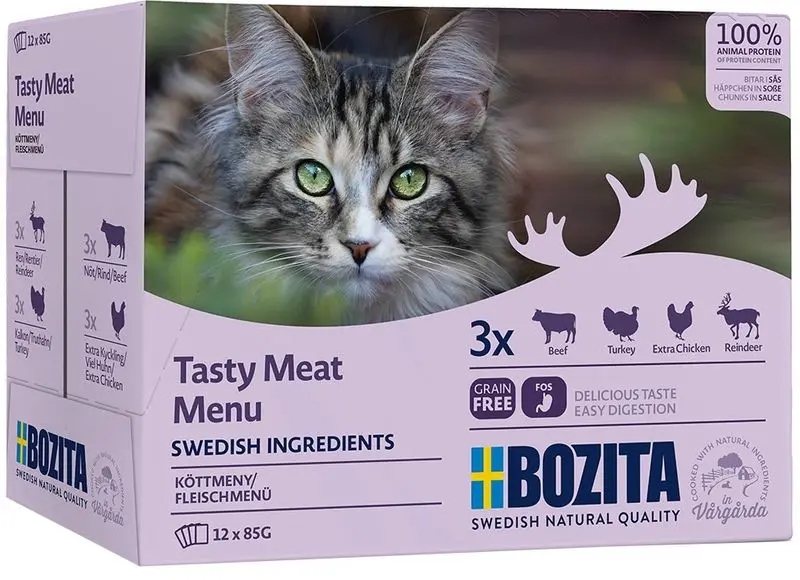 Det populära och svensktillverkade kattmatsmärket Bozita i multibox. 12 smaskiga enportionspåsar med olika fisk- och köttsmaker, t ex ren, nöt, kalkon och kyckling. Ett helfoder för katter, serveras och förvaras rumstempererad (gäller oöppnad portionspåse).