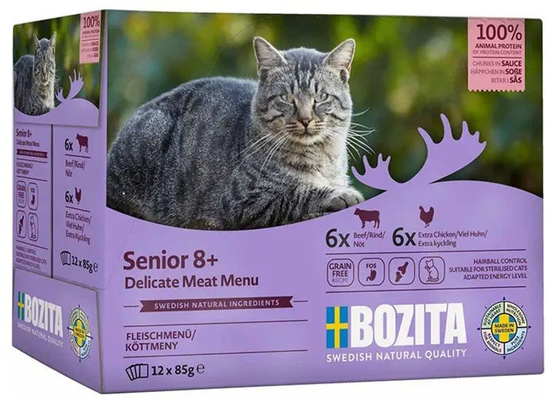 Det populära och svensktillverkade kattmatsmärket Bozita i multibox. 12 smaskiga enportionspåsar med kyckling och oxkött. Ett helfoder för lite äldre katter, serveras och förvaras rumstempererad (gäller oöppnad portionspåse).