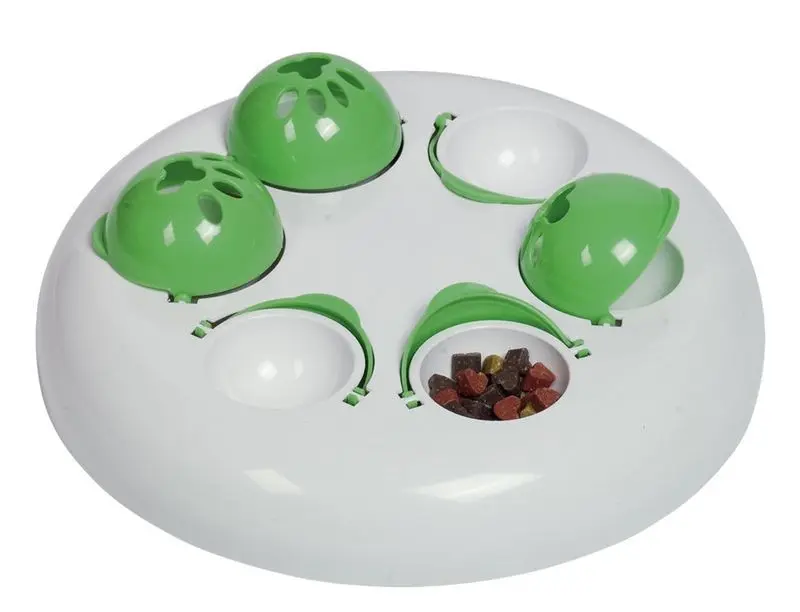Vik tillbaka de gröna "huvorna", placera kattgodis och vik över huvan. Din katt kan sedan nosa sig fram till godisarna och med hjälp av nos och tassar pillra upp den gröna huven för att komma åt sin godis.