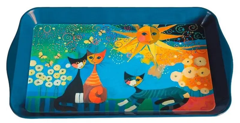 Liten bleckbricka i den nya serien "Dolce Vita" från det populära märket Rosina Wachtmeister. En bricka i perfekt storlek för en temugg och en macka, eller kanske kaffe och bulle. Frukostbricka eller liten fikabricka med härliga kattmotiv.