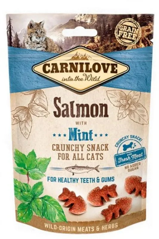 Goda knapriga kattgodisar med Lax & Mynta. Myntan för dess goda egenskaper för hälsosamt tandkött och tänder.