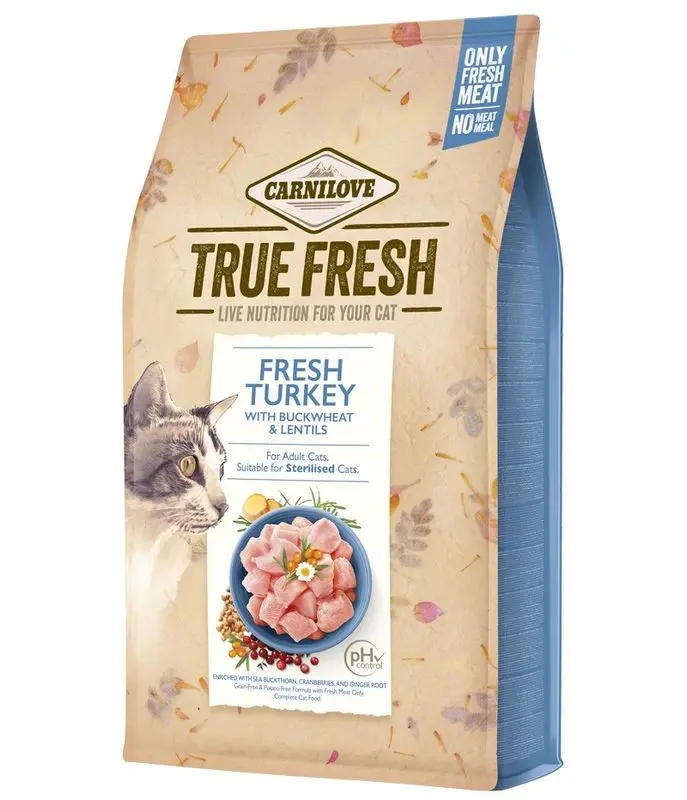 True Fresh från Carnilove är ett torrfoder med ett högt köttinnehåll och speciell tillverkningsprocess. True Fresh Turkey innehåller nämligen kalkonkött som processas i färskt tillstånd, vilket gör fodret väldigt smakrikt och mer lättsmält. Den här sättet att tillverka torrfoder bevarar ingrediensernas ursprungliga egenskaper - och även den kräsna katten brukar uppskatta den naturliga smaken.