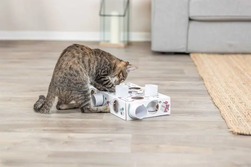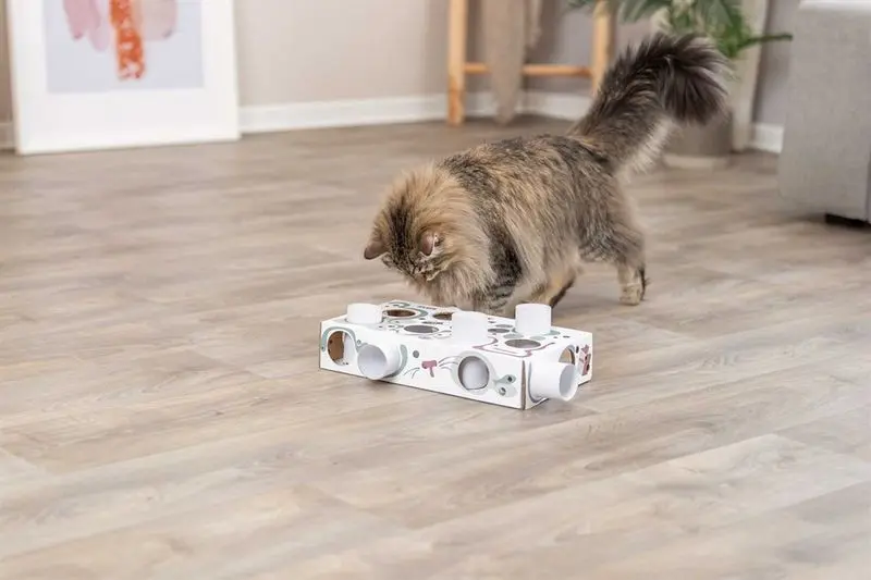 En aktiveringsleksak i papp med lösa rör som kan placeras valfritt på kattleksaken. Kattleksak från det populära varumärket Trixie. Leksaken är tillverkad med aktivitet för kropp och knopp i åtanke, lägg in torrfoder, eller kattgodis eller kattens små favoritleksaker i leksaken. Din katt får sedan klura på hur den ska pillra ut sina favoriter!