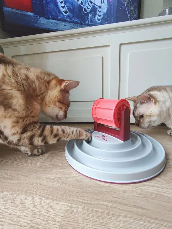 När katten med tassen snurrar på den övre delen och godis faller ut ur snurran så bidrar den spårade brädan undertill att katten äter sitt godis eller sitt torrfoder långsamt.