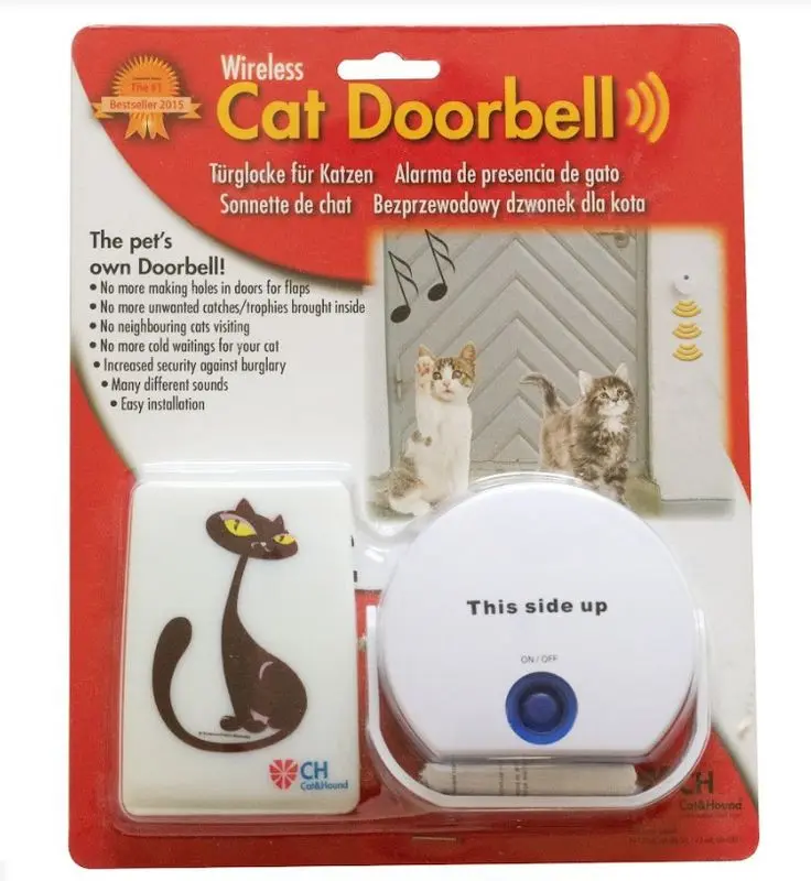Cat Doorbell är en trådlös dörrklocka för din katt, en ringklocka för katter. Den har en IR-sensor som du monterar där din katt brukar sätta sig när den vill bli insläppt (t ex på ett fönsterbleck, altandörren eller ytterdörren). Sensorn känner av rörelsen av din katt och skickar då en trådlös signal till ringklockan / inomhusenheten som meddelar dig med ljus eller ljud att din katt väntar på att bli insläppt.