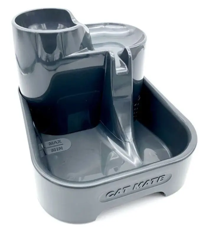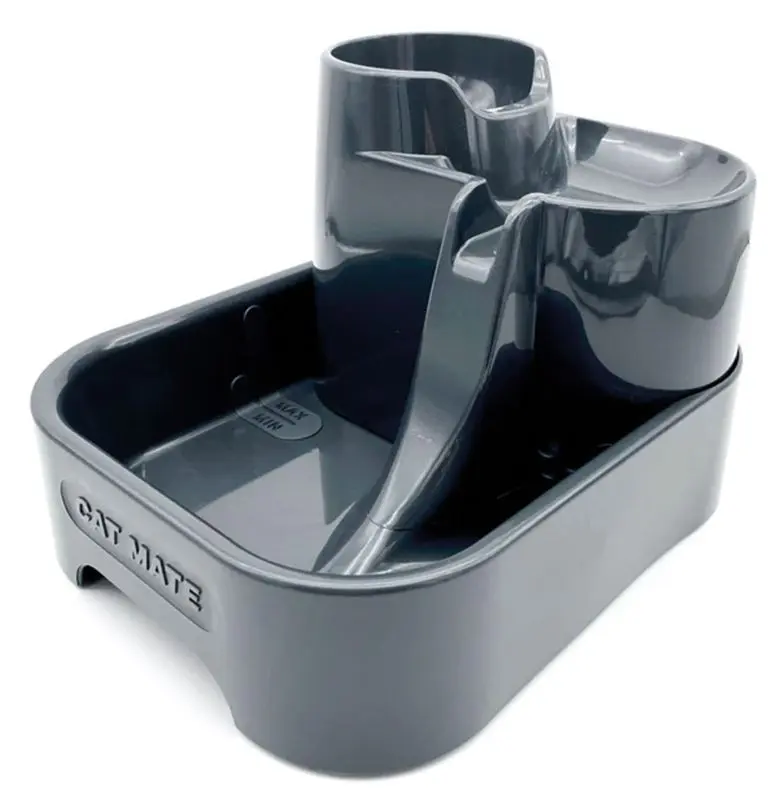 Mörkgrå vattenfontän till katt och liten hund, rymmer 2 liter. Det finns 3 olika höjdnivåer att dricka ur, varav två med porlande vattenfall om din katt föredrar det.
