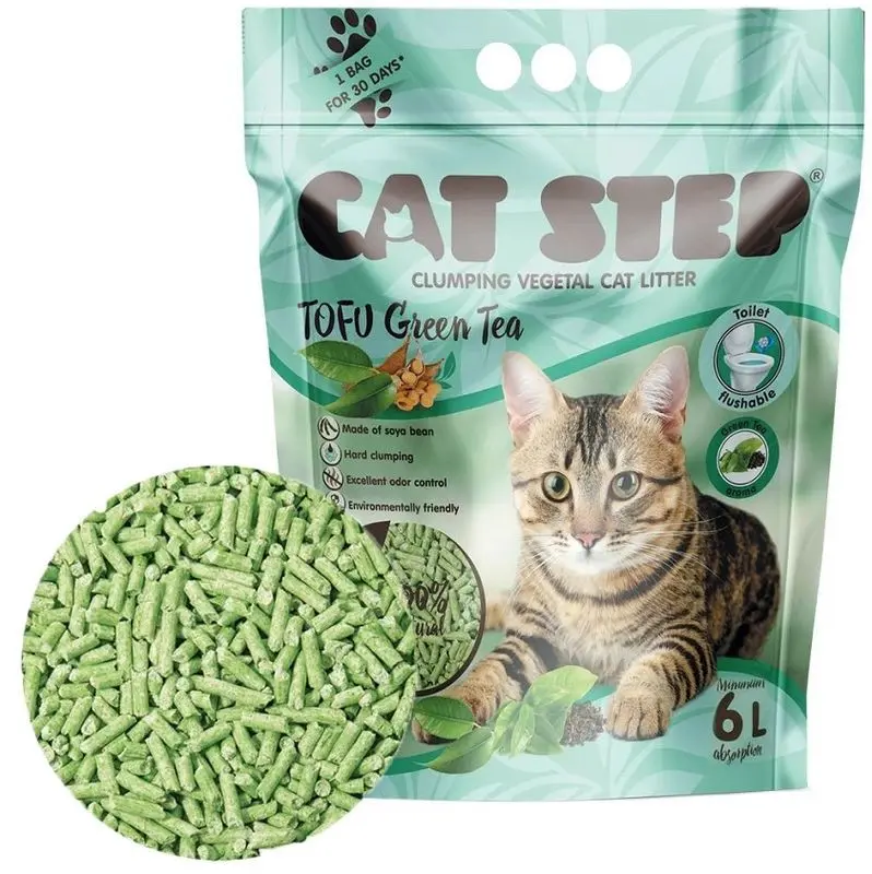 Cat Step är en ny typ av kattsand / pellets som är tillverkad av restprodukter från sojabönor/tofu. Den har en utmärkt absorptionsförmåga och är klumpande, dvs det är lätt att rensa kattlådan.