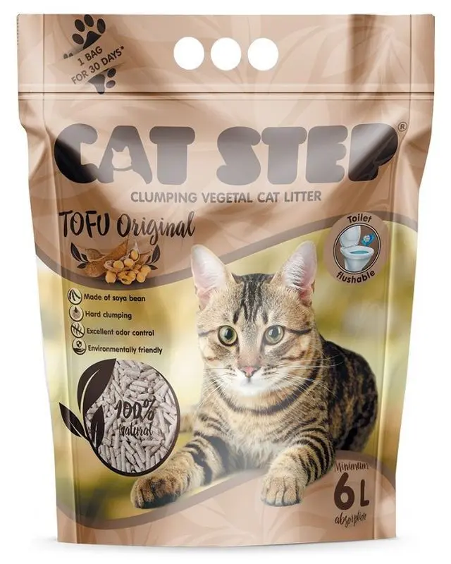Cat Step är en ny typ av kattsand / pellets som är tillverkad av restprodukter från sojabönor/tofu. Den har en utmärkt absorptionsförmåga och är klumpande, dvs det är lätt att rensa kattlådan.