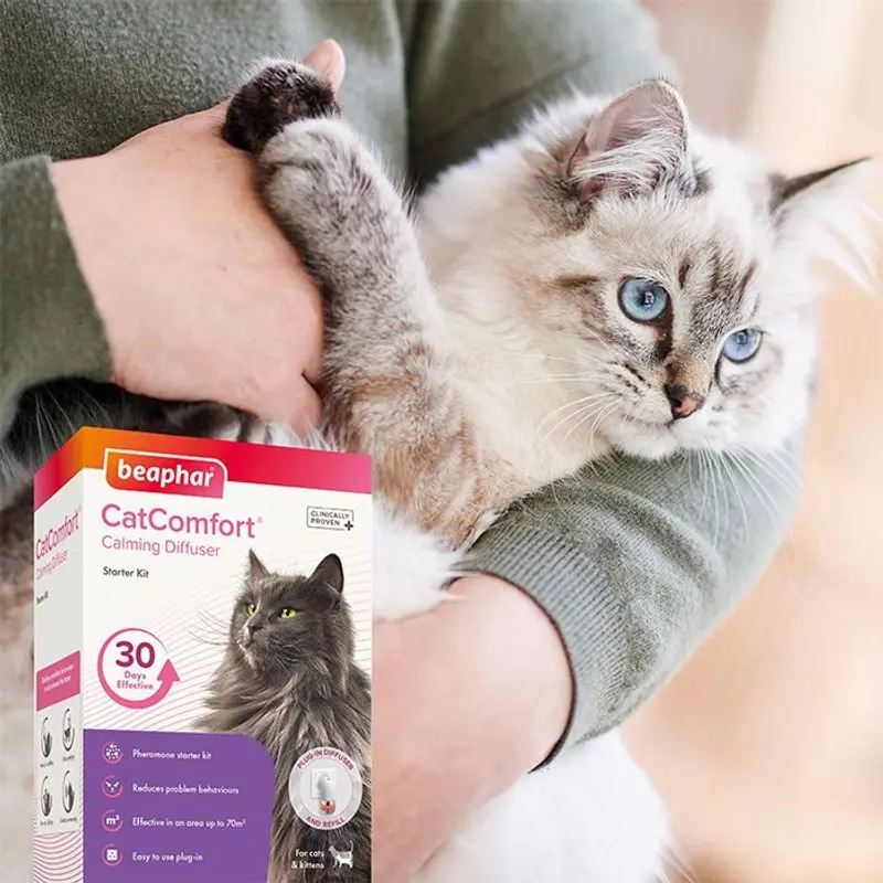 CatComfort Calming Diffuser, från märket Beaphar, är en doftavgivare som pluggas in i elluttaget i hemmet. CatComfort avger katt-specifika feromoner som är kliniskt beprövade för att bidra till en känsla av trygghet och lugn hos katter.
