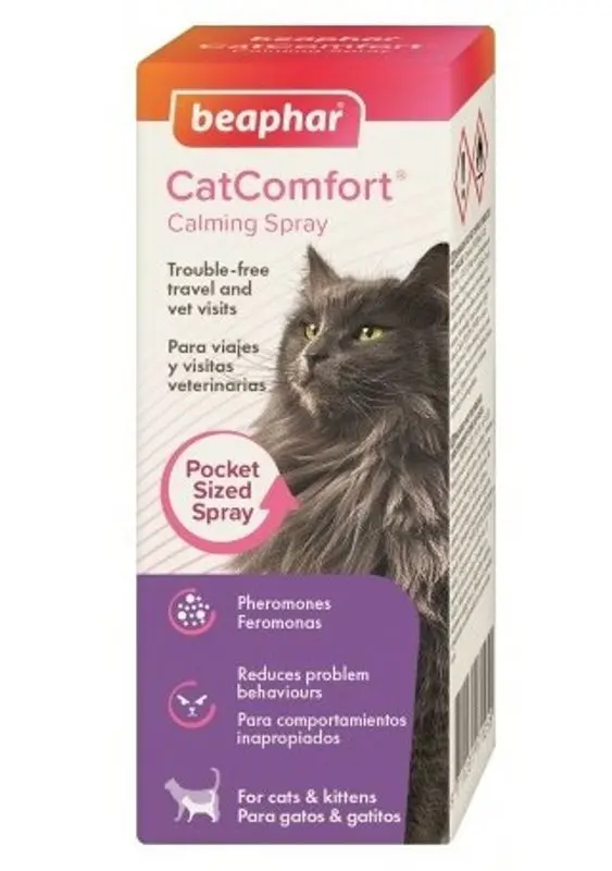 Beaphar CatComfort spray är en produkt som kan sprayas direkt på kattens transportbur, bädd eller klösträd - för att sprida en känsla av lugn och trygghet. Beaphar CatComfort spray tillverkas med syntetiska katt-specifika feromoner som din katt känner igen, de är kliniskt bevisade att lugna och ge din katt en trygghetskänsla.