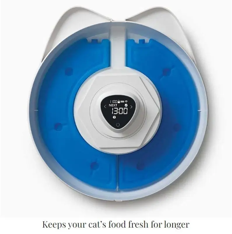 Sätt sedan in de frysta Catit PIXI Ice Packs i det avsedda utrymmet i foderautomaten på Catit PIXI Smart 6-meal feeder. När du använder foderautomaten tillsammans med Ice Packs bidrar kylan till att hålla kattmaten fräsch och sval längre. Se till att inte sätta ner mataren på ett uppvärmt golv när du använder isförpackningarna.