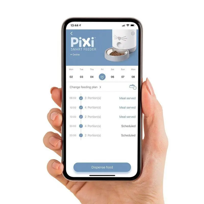 CatIt Pixi Smart Feeder tillgodoser din katts naturliga instinkt att äta flera små måltider under dagen. Med appen är det enkelt att planera en hel veckas schema av måltider med upp till 12 portioner per dygn. Din katts matschema upprepar sig så länge du vill. Foderautomaten kan användas med torrfoder med en diameter eller tjocklek på upp till 9 mm. Den har testats och verifierats för att fungera med standardstorlekar och former på torrfoder.