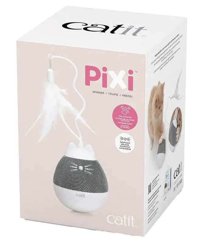 När din katt tassar till denna leksak, kommer Catit PIXI Spinner att börja snurra och förhoppningsvis kommer det ut en och annan kattgodis för att belöna kattens lek. Leksakens tygöverdrag är lätt att greppa med tassarna, den söta kattnosen lyser upp när den aktiveras, vilket är perfekt för nattliga kattlek.