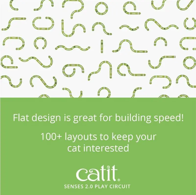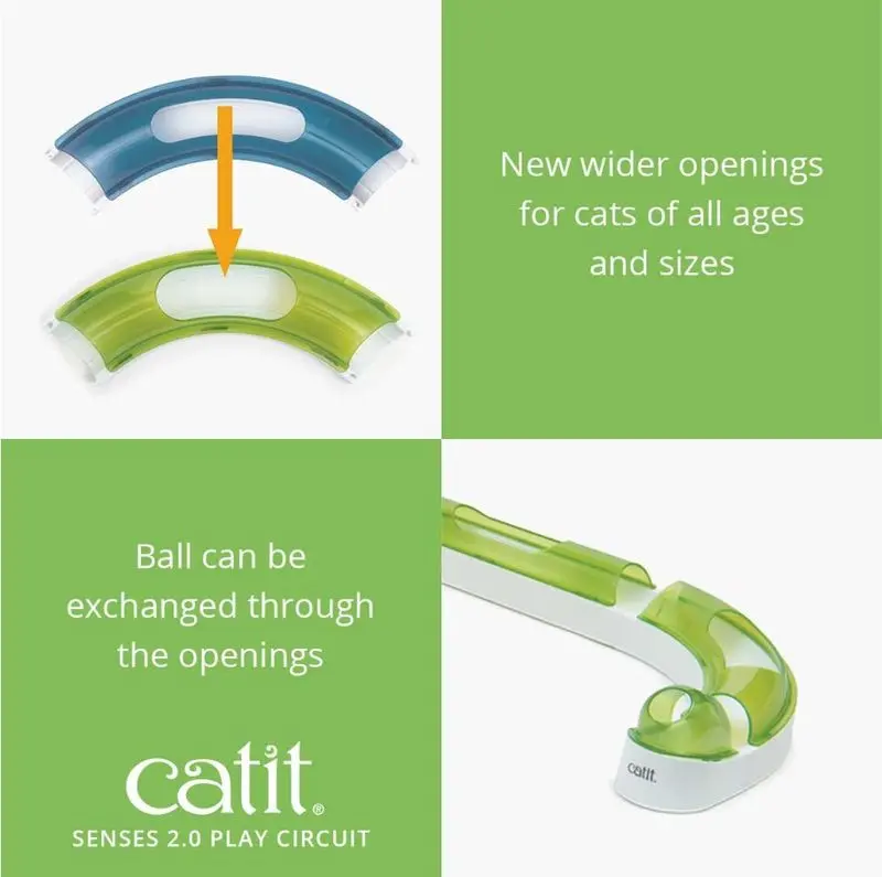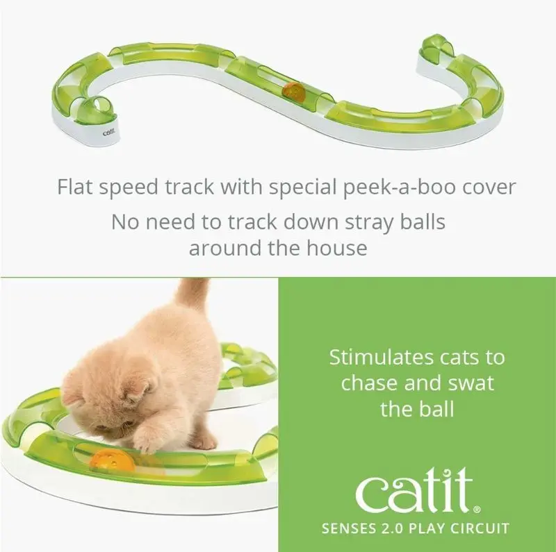 Cat It Senses 2.0 Play Circuit är en bollbana för din katt som kan du bygga ihop på flera olika sätt, t ex i cirkel eller S-form. Katten når bollen genom titt-ut-hålen i ovansidan och kan skjutsa bollen fram och tillbaka i banan. Själva bollen kan dock aldrig smita ut på golvet och kommer garanterat aldrig att hamna under soffan!