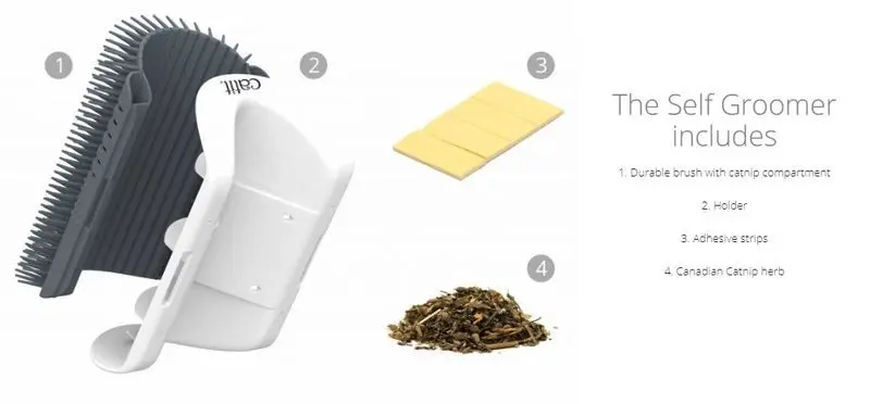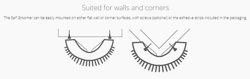 Self Groomer är lätt att ta isär och rengöra från katthår, självhäftande remsor för montering ingår. Produkten kan även skruvas fast på t ex en vägg (skruv ingår ej).