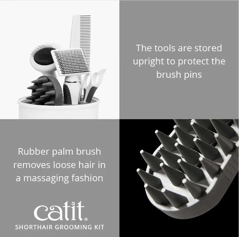 Lyxigt Grooming Kit för korthåriga katter från det populära märken CatIt. Ett kit som innehåller alla de vardagliga verktyg du behöver för att hålla din korthåriga katts päls i trim och samtidigt medför att du och din katt får en trivsam stund tillsammans. (Komplettera gärna med en antistat-spray).