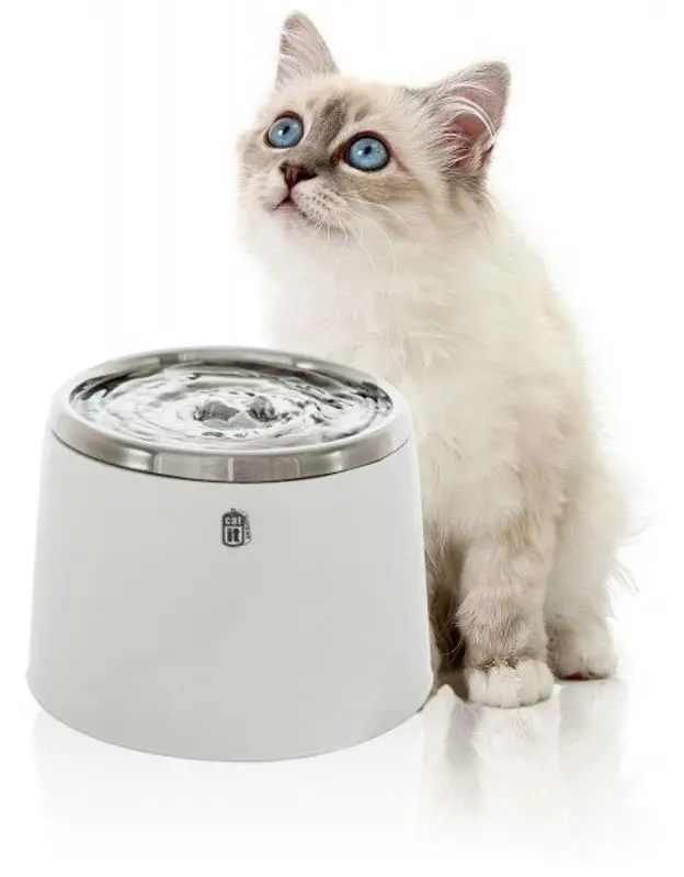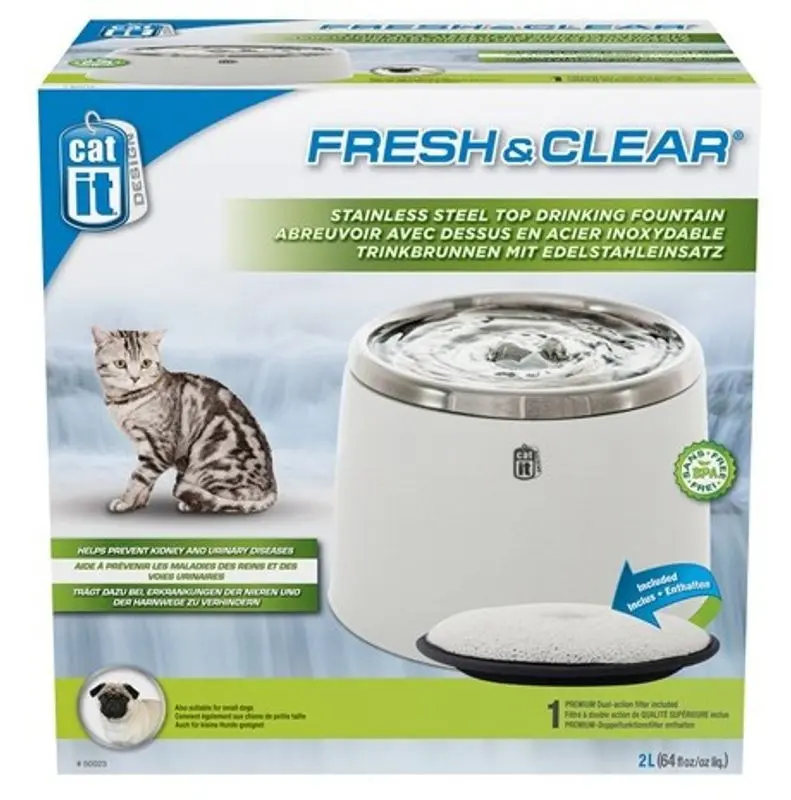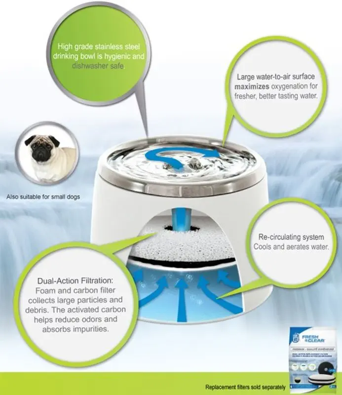 Vattenfontänen stimulerar katten till att dricka mer vatten, vilket kan förebygga bland annat njurproblem. Filtret med aktivt kol fångar upp skräp och katthår i fontänen och håller vattnet fräsht.