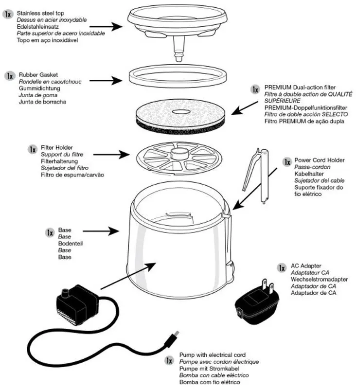 Ett kolfilter och motor ingår i förpackningen, allt du behöver för att köra igång din fontän. (Kolfiltret går att använda i 2-3 veckor innan det bör bytas till ett nytt.)