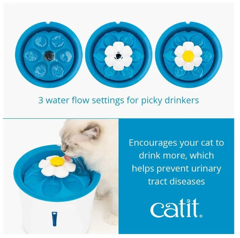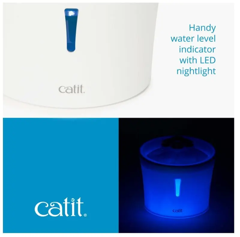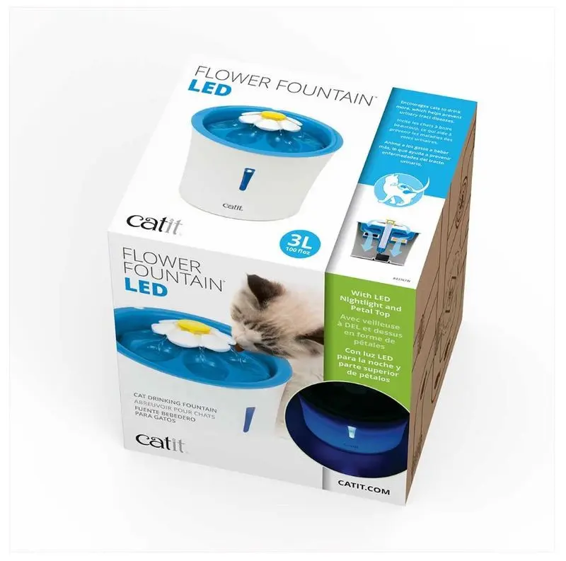 LED-modellen har en "nightligt" som lyser blått när rummet blir mörkt och fontänen har 3 olika lägen för vattenstrålarna så att du kan ställa in den såsom din katt helst vill ha den.