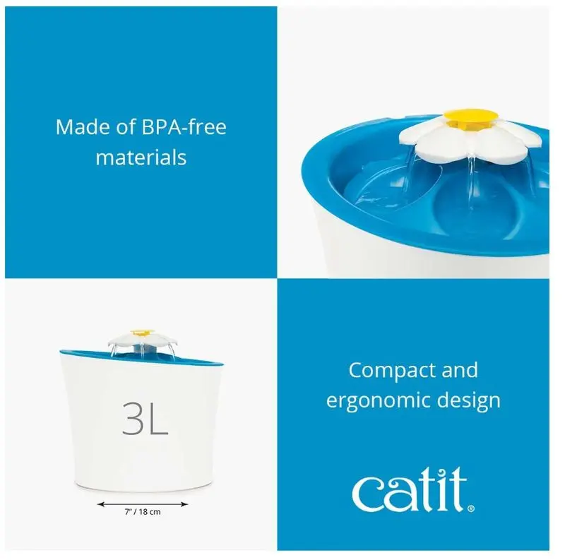 Denna modell är en lekfull nydesign av Cat Its klassiker, enkel att rengöra och fontänen har en bra höjd för katten att dricka ur! Den är spillsäker och fungerar extra bra för katter med stor pälskrage som annars ofta blir blöt i vanlig vattenskål.