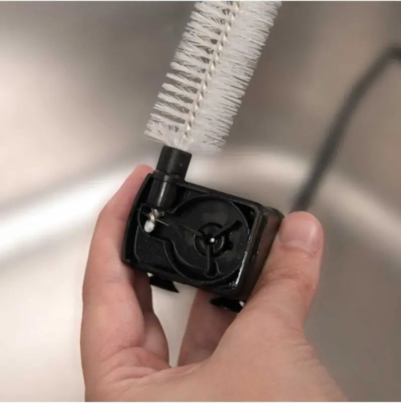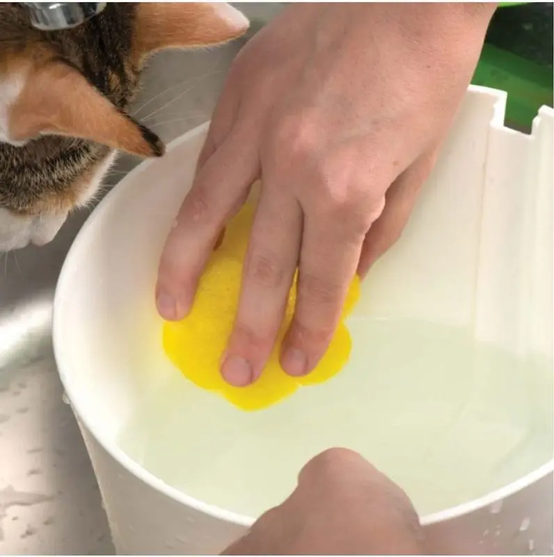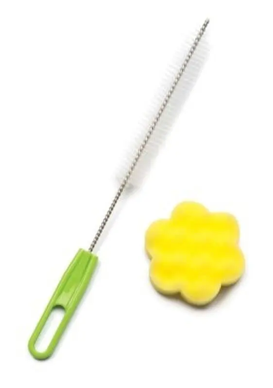 Borste med hårda borst och small topp för att komma åt i trånga utrymmen. Blomformad gul rengöringssvamp med dubbla texturer och vågig yta.