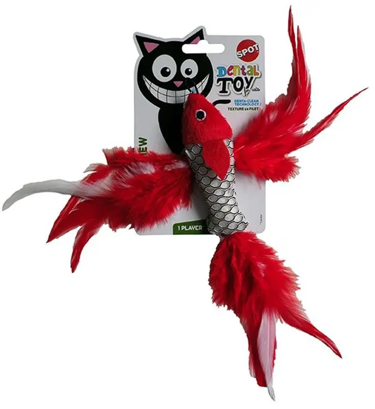 Fin röd fisk med långa fjädrar och kattmynta, extra tuggvänligt material som kan främja din katts tandhälsa.