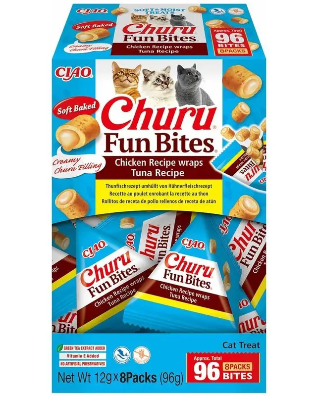 Churu Fun Bites är små, kuddlika snacks fyllda med krämig Churu-puré som katter har svårt att motstå. Den här varianten innehåller smakrik vildfångad tonfisk, innesluten i ett mjukt hölje av kyckling - en perfekt belöning för din katt eller kattunge.