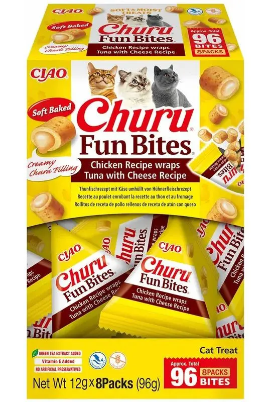 Churu Fun Bites kattgodis är små, kuddlika snacks med en krämig fyllning som katter älskar. Den här varianten innehåller ett yttre lager av kyckling och en läcker fyllning av tonfisk och ost – perfekt för både kräsna katter och som en extra lyxig belöning.