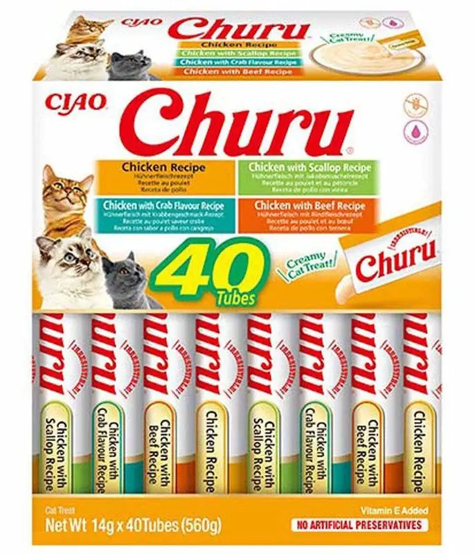 I detta storpack får din katt 40 st Churu, 10 st tuber av varje smak.