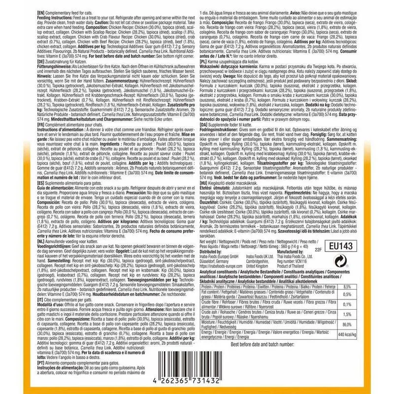 Vatten, Kyckling, Tapioca, Kammussla, Natural Flavors, Natural Scallop Flavor, Guar Gum, Fructooligosaccharide, Vitamin E Supplement, Green Tea Extract.
