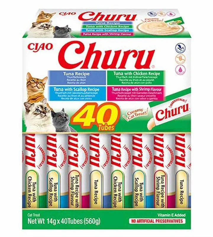 Churu Creamy kattgodis består av tuber med krämigt kattgodis som du klämmer ut och låter din katt slicka upp. Du kan också klämma ut kattgodiset ovanpå på din katts mat som smaskig topping eller ensamt i en skål som smarrig efterrätt. Perfekt hjälp även vid kloklippning eller för att ge din katt medicin/tabletter på ett enkelt sätt.