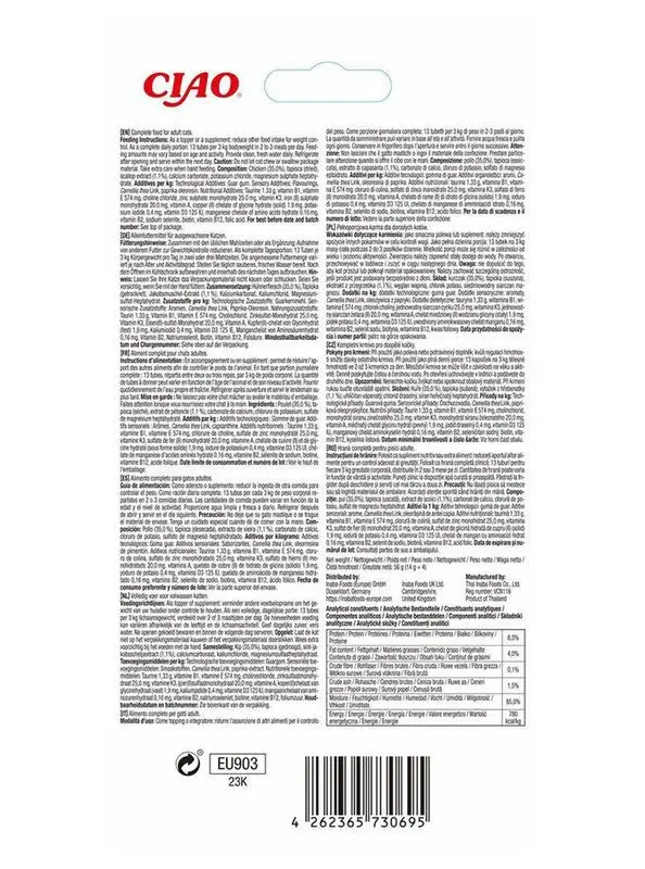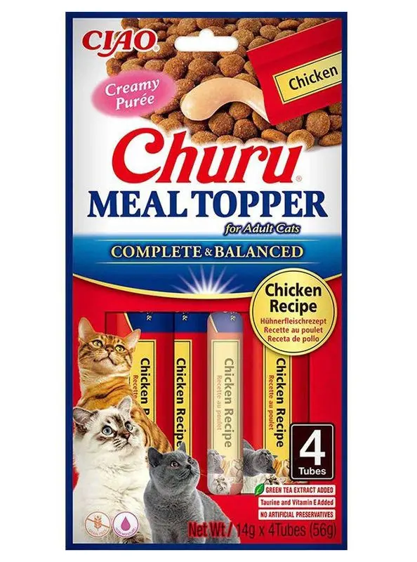 "Din katts liv är nu komplett: Komplett och helt balanserat vill säga - vi har tagit densamma krämiga purékonsistensen som i Creamy Snacks. En konsistens om katter älskar och nu packat den tillsammans med alla vitaminer och mineraler som katten behöver i en kattmat - wrapped up i en serveringstub." Lika lätt att servera hemmavid som on-the-go. "Din katt är viktig för oss, därför har vi hållt våra Churu Meal Toppers helt fria från spannmål, konserveringsmedel, karragenan och konstgjorda färgämnen."