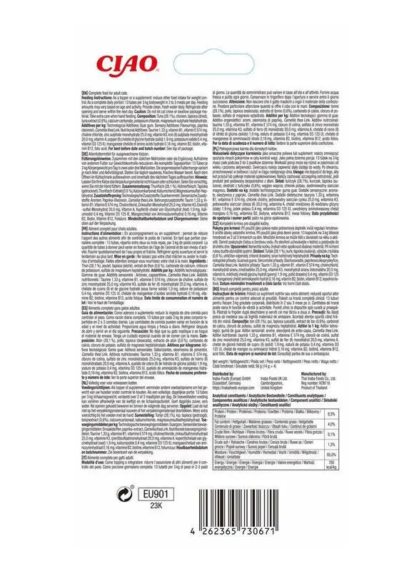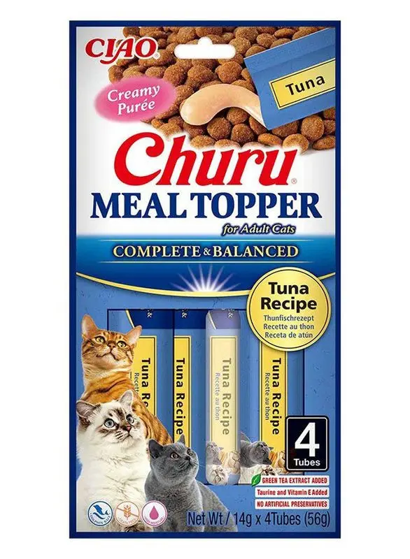 "Din katts liv är nu komplett: Komplett och välbalanserat vill säga - vi har tagit densamma krämiga purékonsistensen som i Creamy Snacks. En konsistens om katter älskar och nu packat den tillsammans med alla vitaminer och mineraler som katten behöver i en kattmat - wrapped up i en serveringstub." Lika lätt att servera hemmavid som on-the-go. "Din katt är viktig för oss, därför har vi hållt våra Churu Meal Toppers helt fria från spannmål, konserveringsmedel, karragenan och konstgjorda färgämnen."