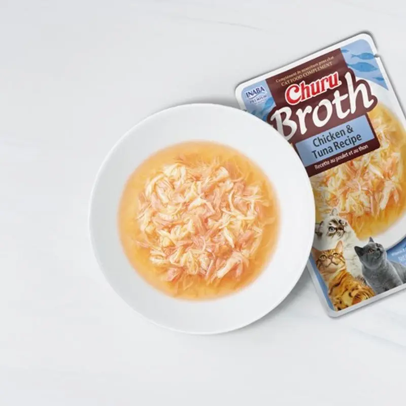 Churu Sidedish är en portionspåse med kyckling och tonfisk i en välsmakande buljong. Ett kompletteringsfoder som kan ges som något extra gott till din katt. Strimlad kyckling och tonfiskflingor i en smakrik kycklingsås.
