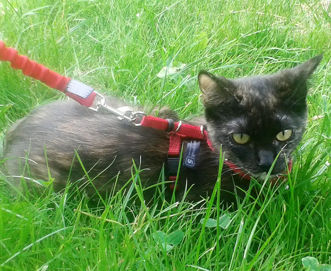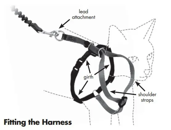Selen är justerbar både i framdelen och kring bröstkorgen på din katt. Kopplet som medföljer är elastiskt, vilket ger ett mjukt ryck (istället för ett stumt stopp) om din katt plötsligt drar iväg. Det gör även att din katt upplever ett "tryck" tillbaka till dig vilket kan vara ett hjälpmedel för att lära din katt att du är ute på promenad med katten och inte tvärtom ;)