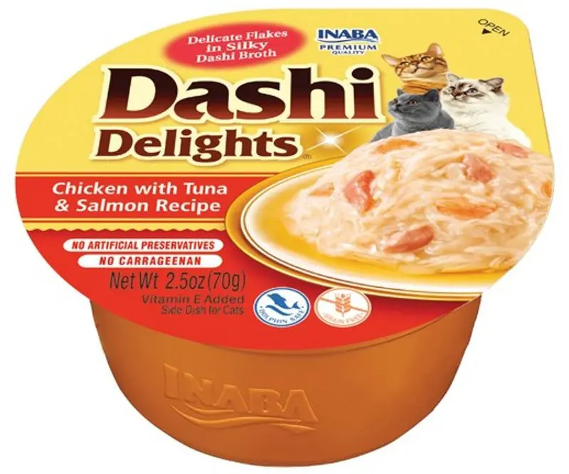 Dashi Delight med smak av kyckling med tonfisk och lax, är ett supergott och näringsrikt komplement till din katts måltider, och en smakupplevelse som den med säkerhet kommer att älska!