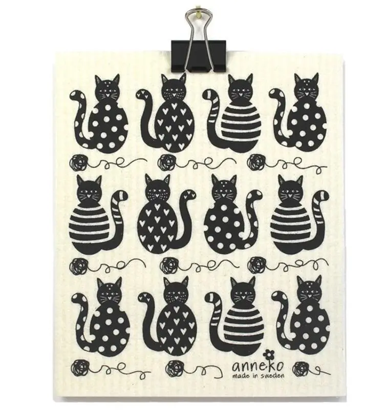 Disktrasa med AnnEkos fina kattmotiv som piffar upp köket och är snäll med miljön samtidigt. Trasan är tryckt med med vattenlöslig och miljövänlig färg. Trasan tål kokning och är tvättäkta i 90°.