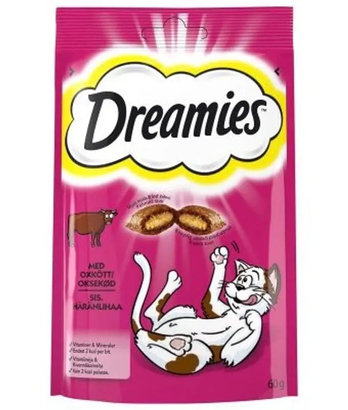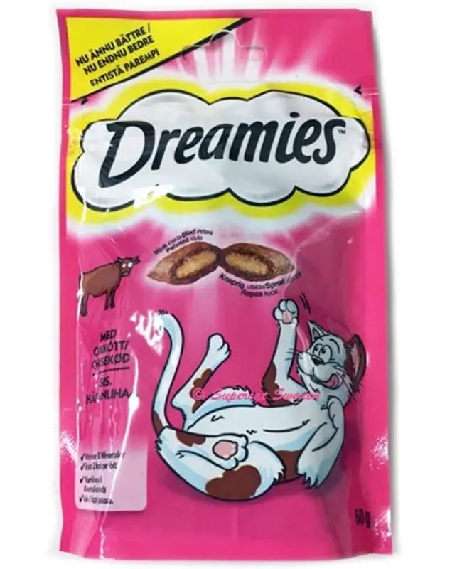 Dreamies är ett kattgodis med knaprig utsida och en mjuk och mumsig insida. Innehåller inga konstgjorda smakämnen eller luktämnen. Perfekt som litet belöningsgodis till din kisse. Förpackat i praktiskt återförslutningsbar påse som håller godiset fräscht samt prasslar inbjudande när man skakar på den.