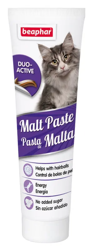 När katten tvättar sin päls så kan det bildas hårbollar i magen som stör matsmältningen. Detta kan leda till att katten spyr, blir förstoppad eller får diarré. Katter som inte rör på sig tillräckligt mycket kan även de drabbas av stört matstmälningssystem såsom förstoppning. Mot detta hjälper denna kattmalt i pastaform.