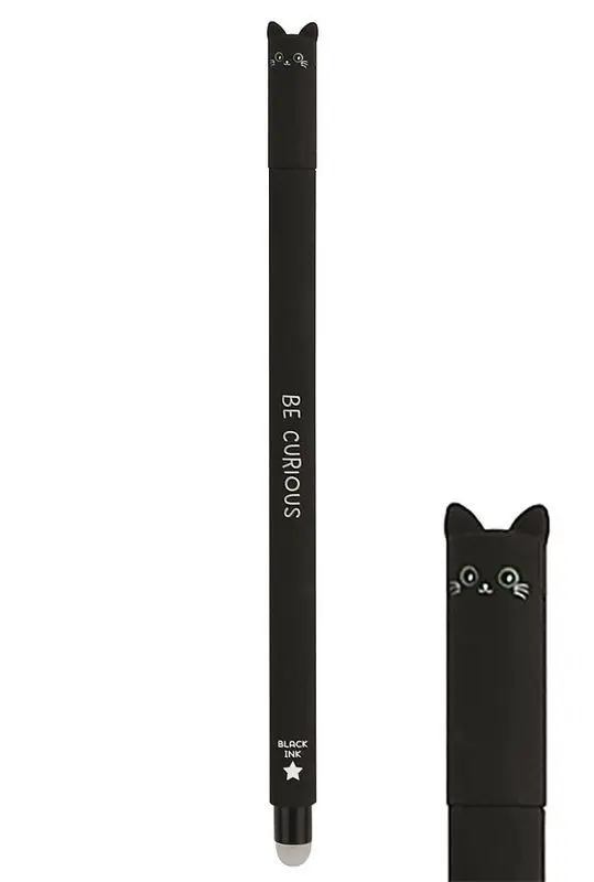 Pennans kork är formad som ett litet katthuvud och på pennan står det "Be Curious".