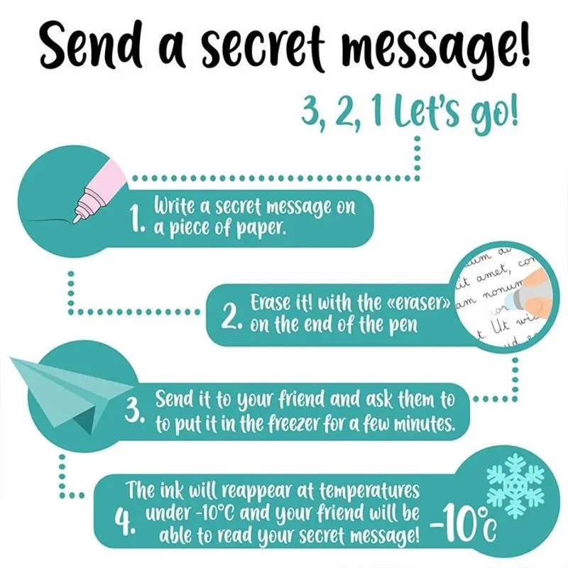 Du kan även "framkalla" texten som du suddat bort genom att lägga pappret i frysen en stund. Perfekt present till busiga barn i "skriva-lappar-åldern" som vill skicka hemliga meddelanden till varandra!
